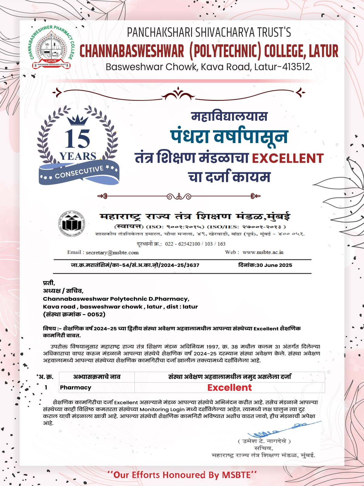✤ Receiving excellent grade in External Institute Monitoring of MSBTE, Mumbai since 2012. |